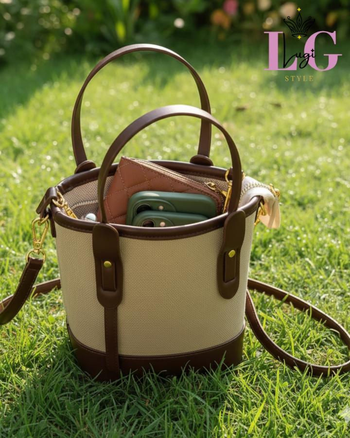 Su estructura tipo cubeta en tonos beige y café aporta un estilo natural y versátil, ideal para acompañarte en tu día a día, viajes o eventos especiales.