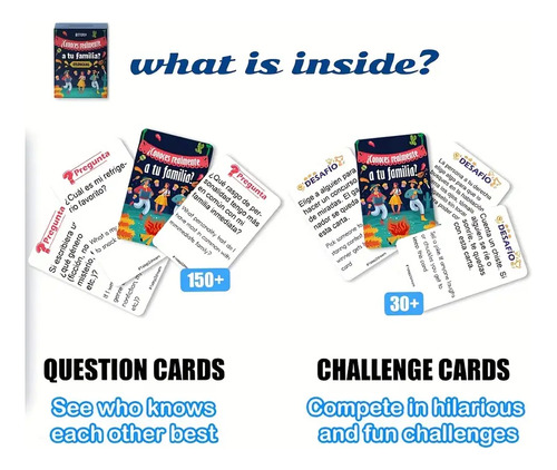 Perfecto para reuniones familiares, fiestas o simplemente para pasar un rato diferente en casa, este juego fomenta la conversación, la risa y la complicidad entre todos los participantes.