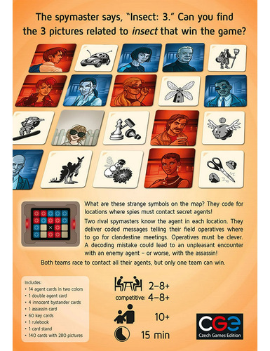 Codenames Pictures es un juego de mesa de deducción y trabajo en equipo donde los jugadores deben descubrir qué imágenes pertenecen a su grupo usando solo una palabra como pista. Dos equipos compiten con la ayuda de su “jefe de espías”, quien conoce la ubicación de las imágenes secretas y debe guiarlos sin revelar demasiado. Con ilustraciones intrigantes y llenas de detalles, cada partida es un reto único que combina creatividad, observación y estrategia. Ideal para jugar en grupo y disfrutar de momentos divertidos e ingeniosos.