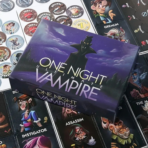 One Night Ultimate Vampire es un intenso juego de roles ocultos donde cada partida dura solo 10 minutos, ¡pero está cargada de intriga, deducción y engaños! Al inicio de la noche, todos los jugadores reciben un rol secreto, desde aldeanos hasta poderosos vampiros, pasando por criaturas con habilidades únicas como el Cupido, el Asesino o el Vigilante.