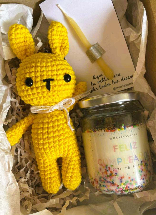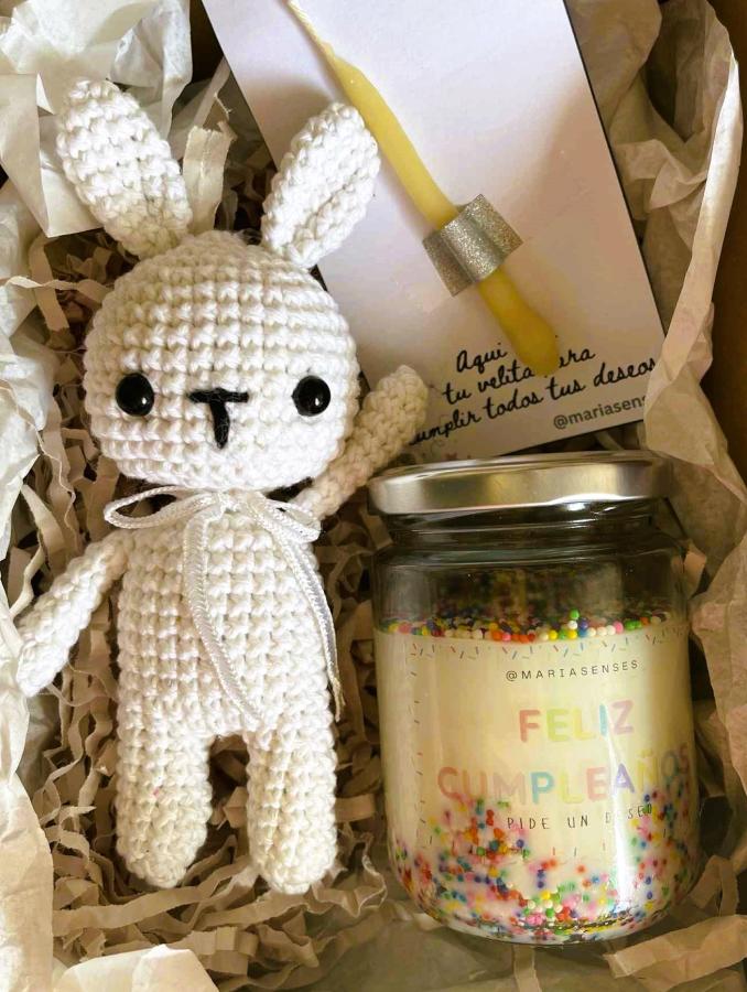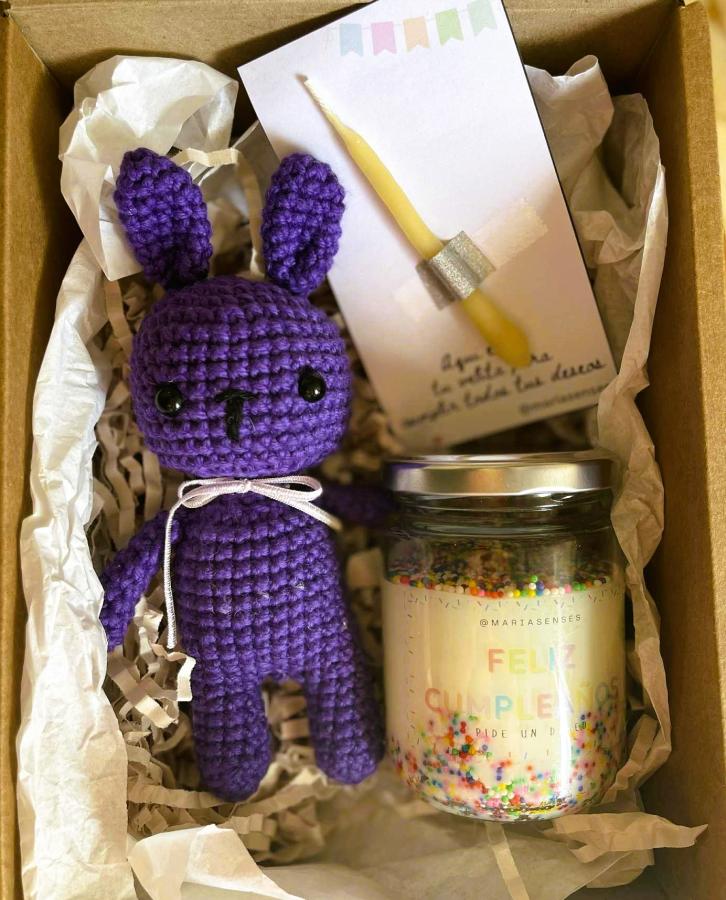 Dentro de esta cajita vas a encontrar un conejito tejido artesanalmente, que se queda como recuerdo y compañía; una vela de cumpleaños con aroma tutti frutti, alegre y chispeante, que perfuma con notas dulces y frutales que despiertan la sonrisa; y una velita para soplar y pedir deseos, porque ningún cumpleaños está completo sin ese momento mágico de cerrar los ojos y soñar.