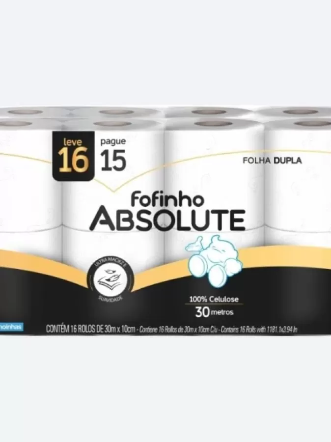 El Papel Higiénico Fofinho Absolute de doble hoja (16x30mts) es ideal para quienes buscan calidad y confort. Su diseño suave y altamente absorbente garantiza una limpieza efectiva y agradable. Cada rollo ofrece más metros por rollo, lo que significa menos cambios y más tranquilidad en tu hogar.
