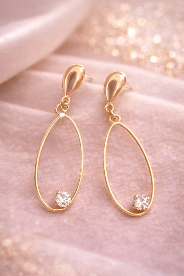 Diseño fino y femenino, con caida suave y terminacion prolija .su forma ovalada estiliza el rostro y la piedra blanca central aporta un toque de luz sutil y elegante.