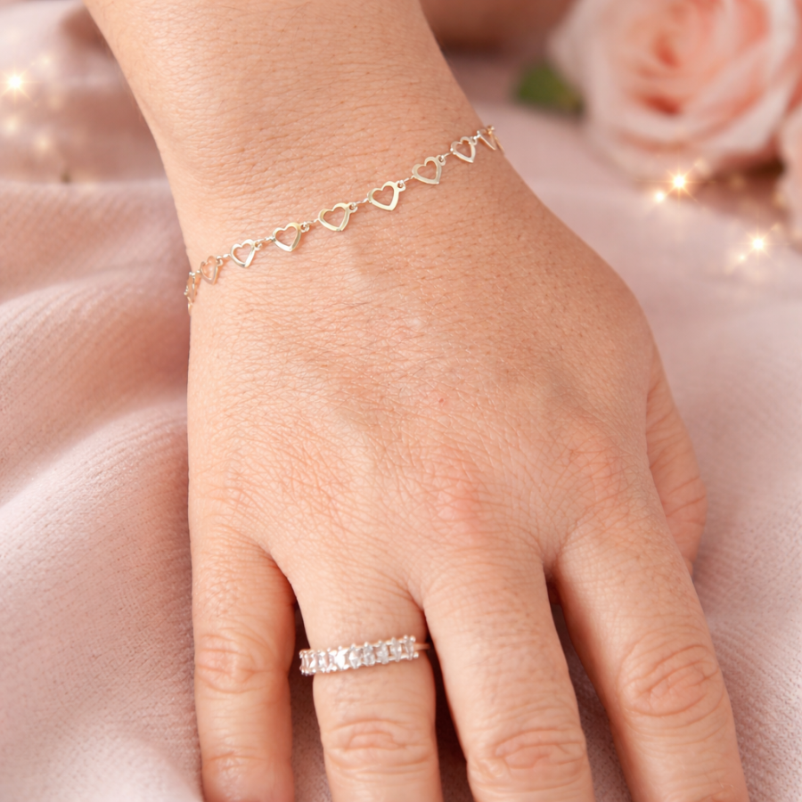 Maniila de plata con corazones unidos,de estilo romantico y elegante.liviana y comoda para llevar sola o combinada con otras joyas.