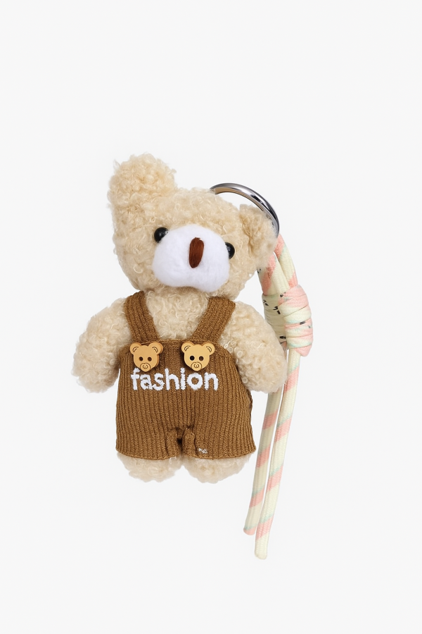 El llavero Teddy Fashion está confeccionado en felpa texturizada con mini overol de pana marrón y tiras decorativas, creando un accesorio que transmite calidez y personalidad.