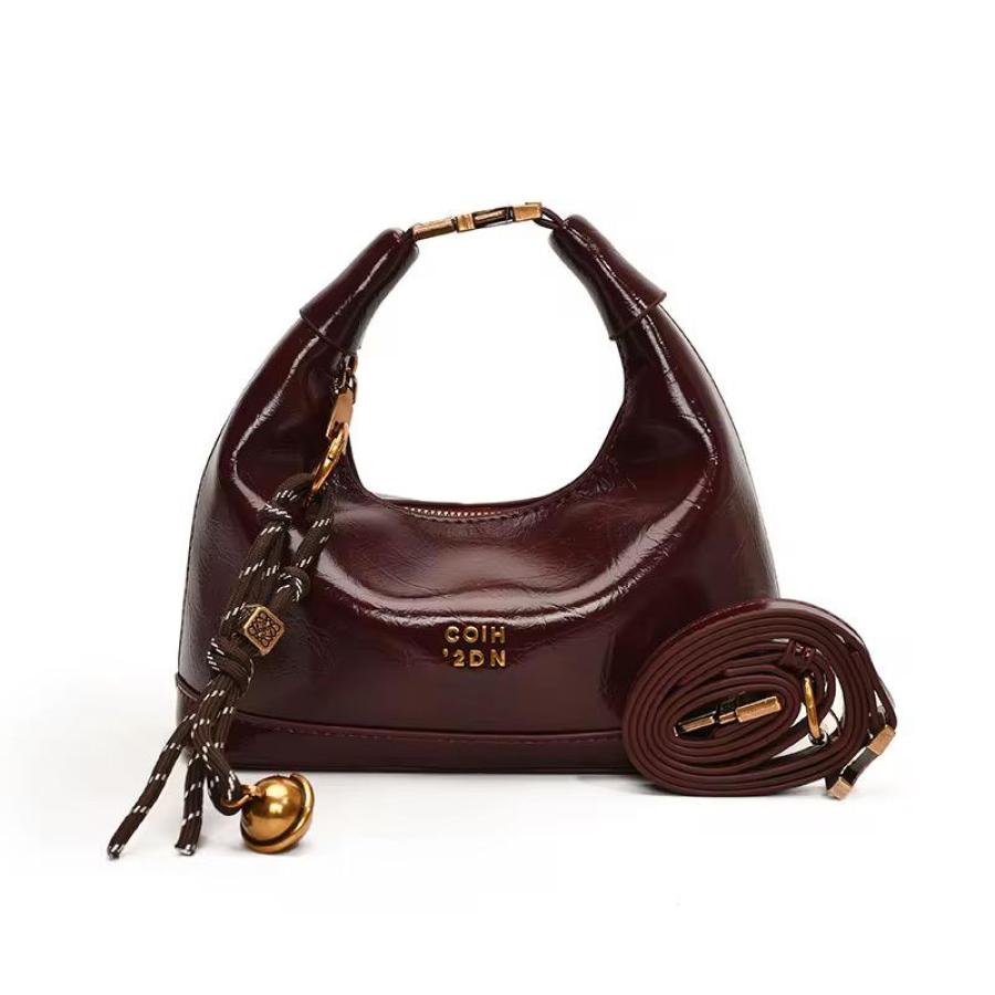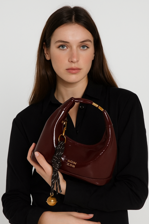 El bolso Aria se distingue por su silueta estructurada y su acabado brillante en tono borgoña profundo, acompañado por delicados herrajes dorados.