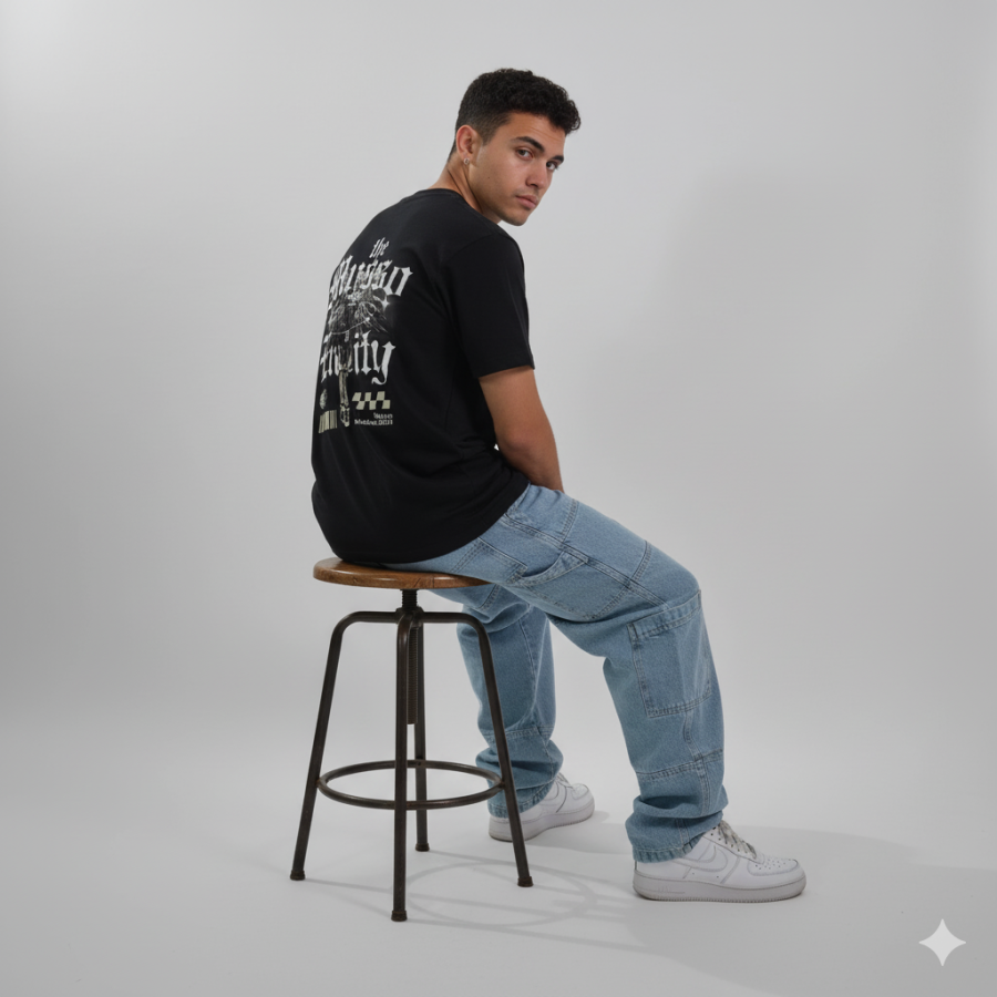 Una pieza que no busca agradar, sino destacar. “The Musso Entity” representa la unión entre lo humano y lo divino en clave urbana. El diseño combina simbología angelical con estética industrial y tipografía gótica, creando una prenda que parece salida de un universo paralelo donde el arte y la oscuridad conviven con elegancia.