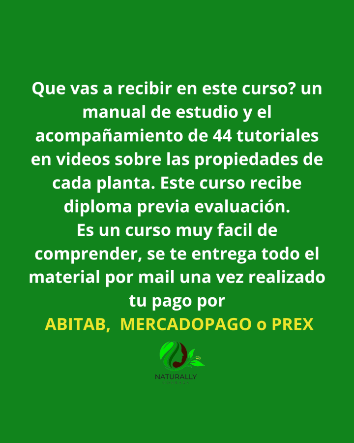 Que vas a recibir en este curso? un manual de estudio y el acompañamiento de 44 tutoriales en videos sobre las propiedades de cada planta. Este curso recibe diploma previa evaluación.