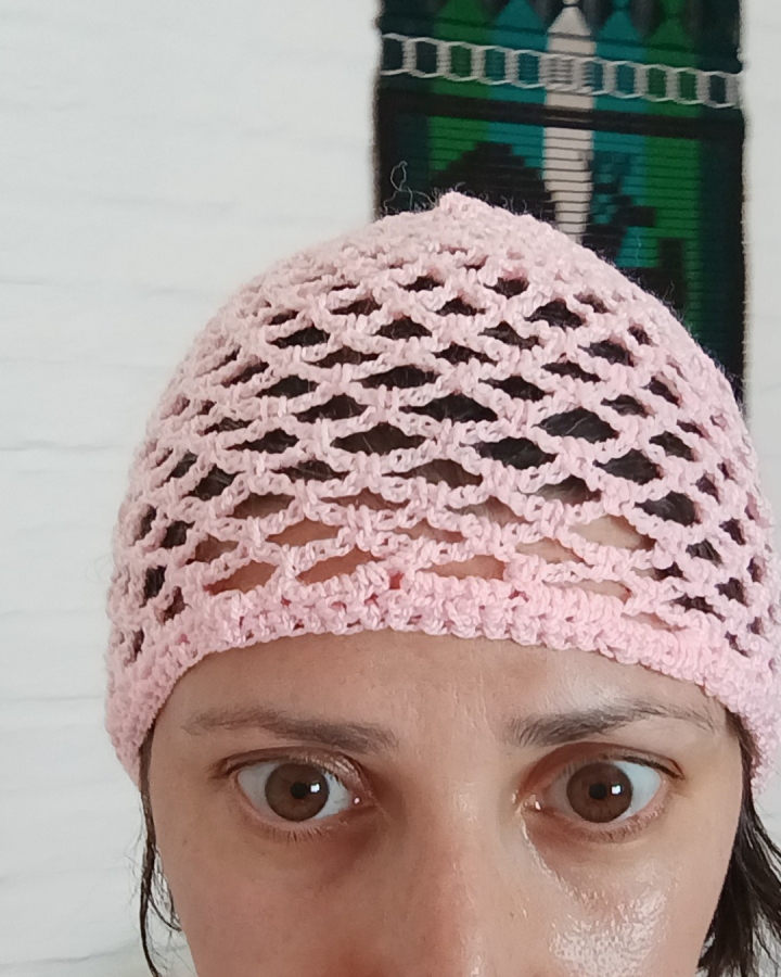 Gorrito tejido completamente a mano por mi abuela de 94 años, con diferentes hilos y diseños en cada uno.