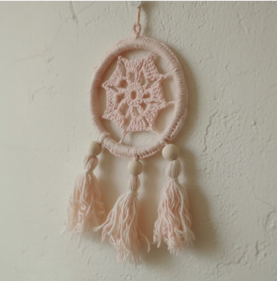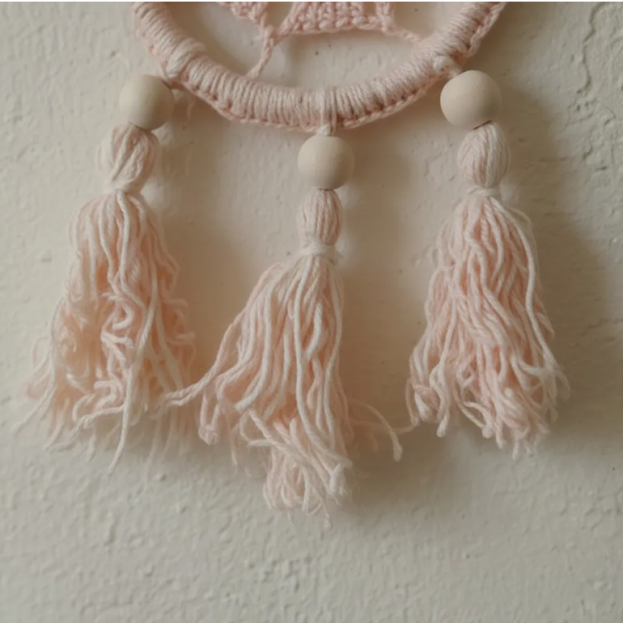 Está realizado en crochet con hilo súper fino y suave en tono salmón pastel, acompañado de flequitos con volumen y cuentas de madera natural que aportan textura y calidez.
