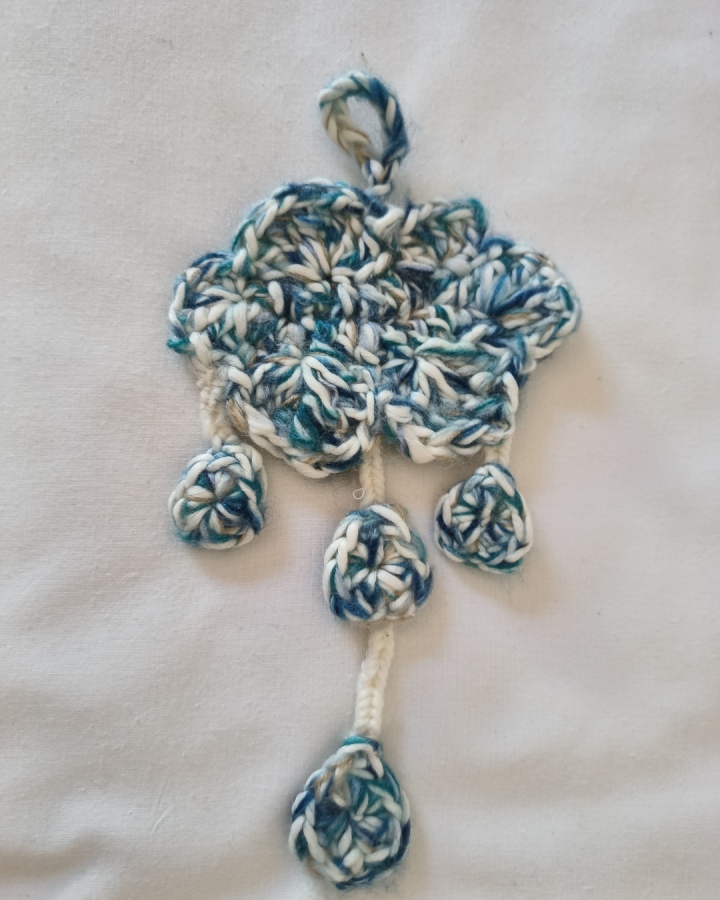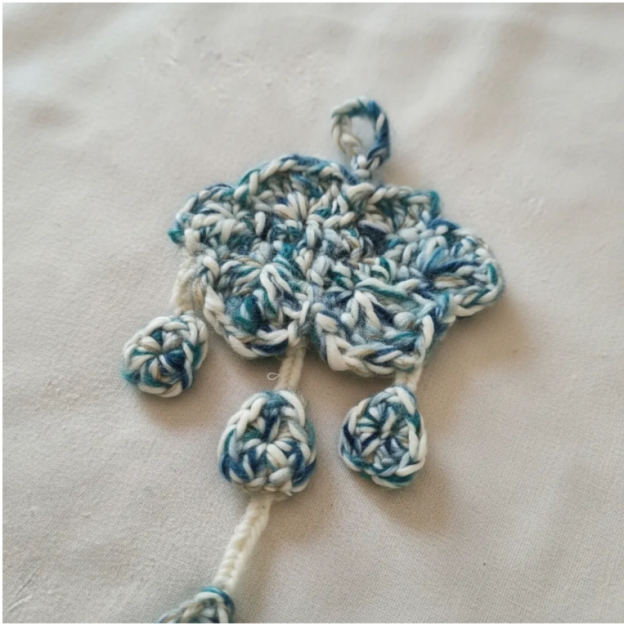 Nube decorativa tejida completamente a mano en lana gruesa matizada, en tonos blanco, celeste, turquesa y azul petróleo, que le aportan un efecto suave, esponjoso y delicado.