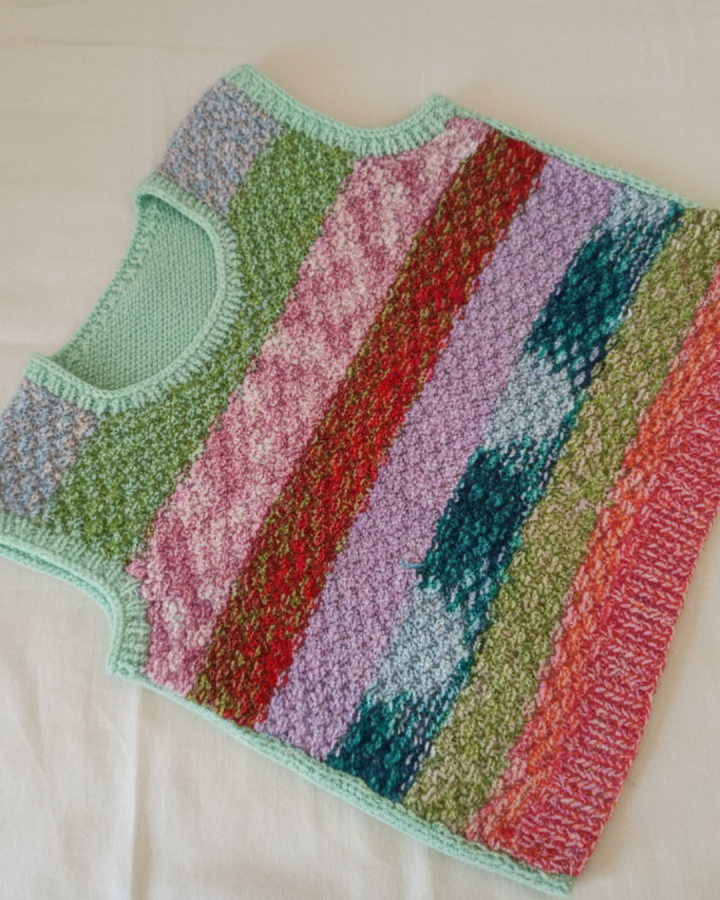 Este chaleco fue tejido completamente a mano por mi abuela de 94 años, combinando distintos puntos de crochet que le aportan relieve, firmeza y textura, sin dejar de ser cómodo y liviano.