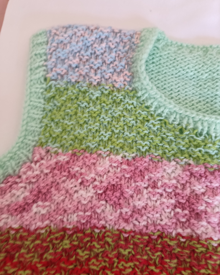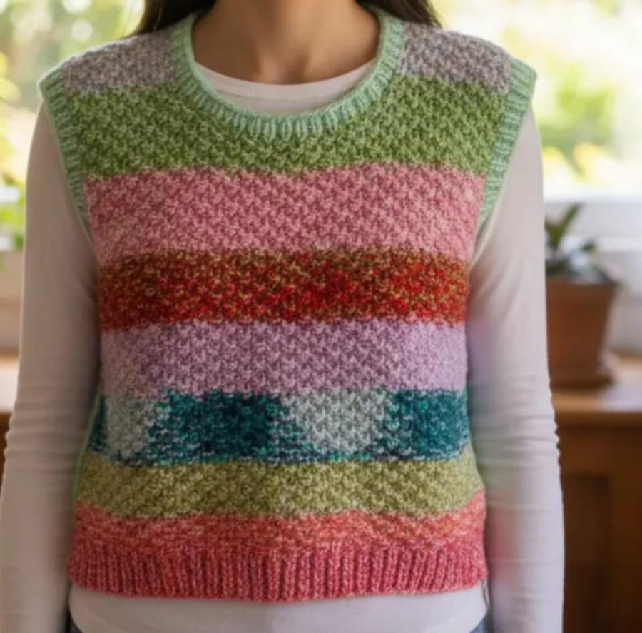 La franja de colores en tonos pasteles y vibrantes le da un toque alegre y actual, ideal para usar como prenda de capa sobre remeras, camisas o vestidos.
