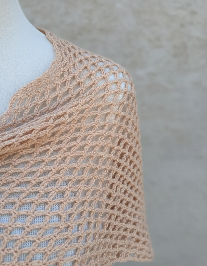 Cada punto fue realizado con técnica calada tradicional, en un proceso lento y consciente, respetando el ritmo del tejido y la caída natural del hilo.