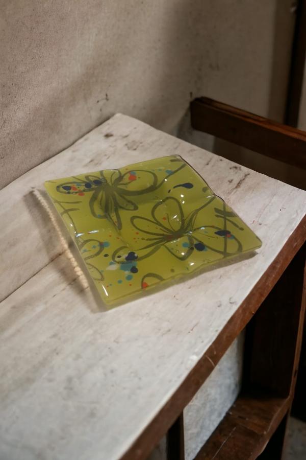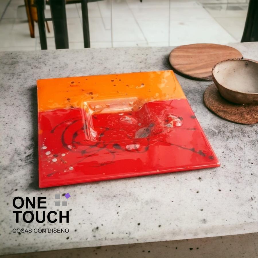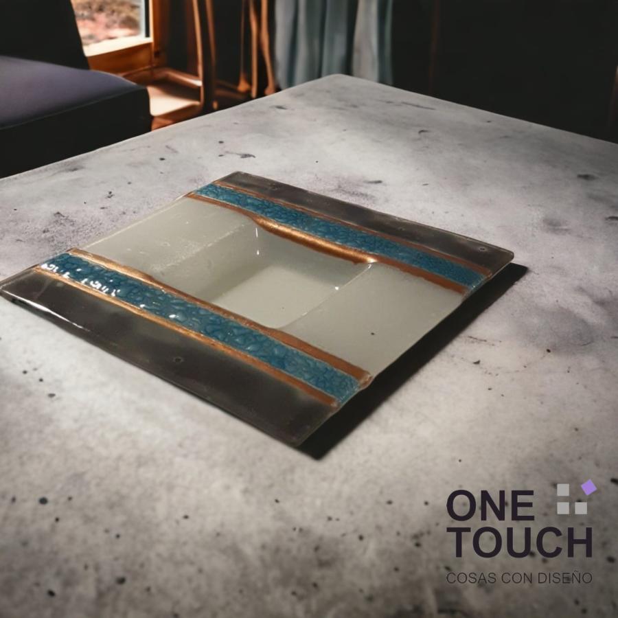 Realizado artesanalmente en doble vidrio float. Su formato cuadrado de 26 cm por lado lo convierte en una pieza versátil: funciona como fuente baja, bandeja decorativa o pieza protagonista en la mesa.