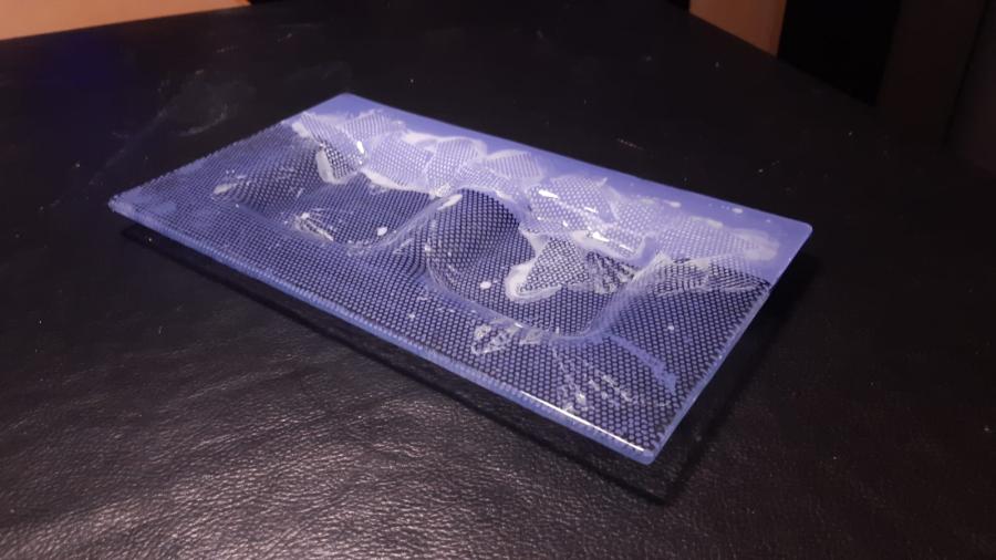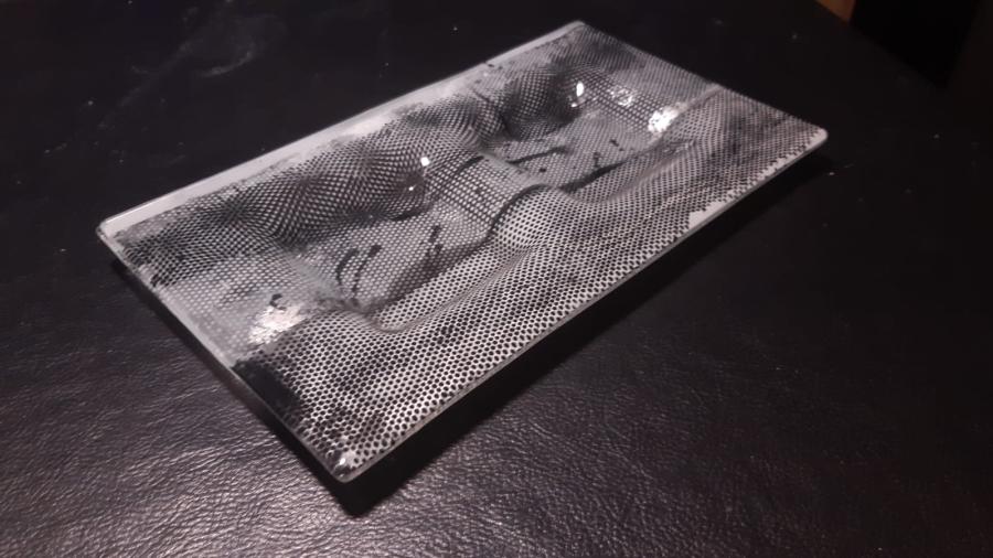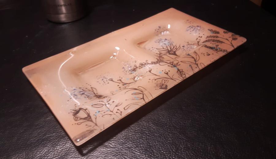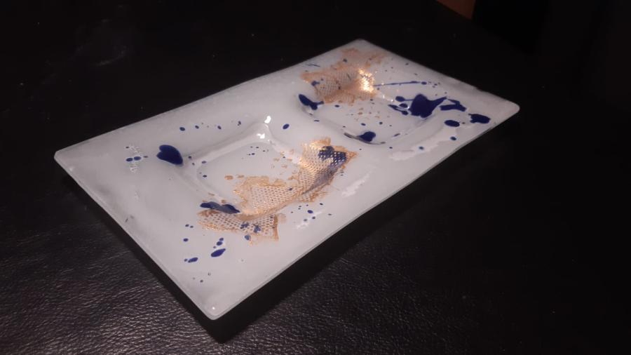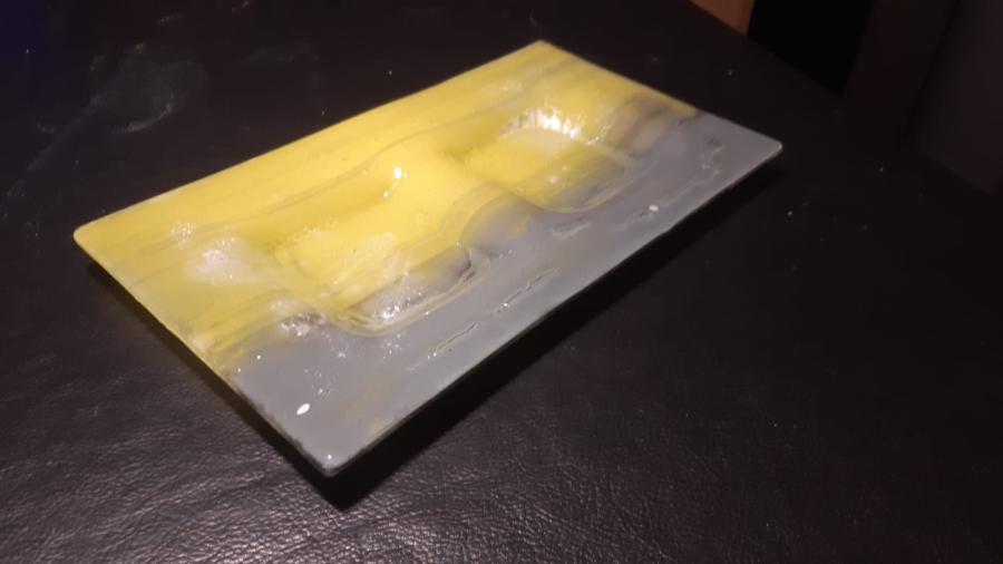 Cada pieza se trabaja a mano en vitrofusión, logrando una forma orgánica y equilibrada que permite presentar frutos secos, dips o pequeños bocados con estilo.