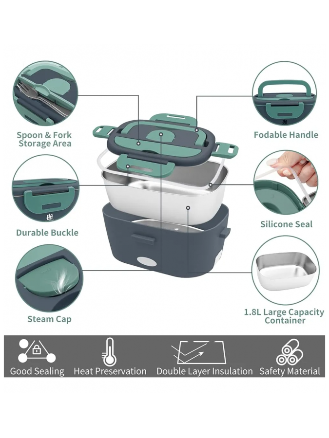 Disfrute de comidas saludables en cualquier lugar: ¡No se requiere microondas! Nuestra nueva versión de la lonchera con calefacción eléctrica de 40 W lo ayuda a calentar los alimentos más rápido que otros calentadores de loncheras para automóviles. ¡Solo unos 20 minutos de tiempo de calentamiento! Simplemente conéctelo, disfrute de su comida caliente y saludable en el automóvil o en la oficina.