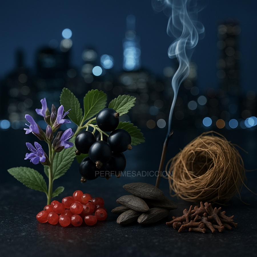 Misterio urbano en azul profundo: chispa especiada, un corazón mineral y humo elegante que se funde con maderas oscuras. Una estela intensa, seductora y moderna.
