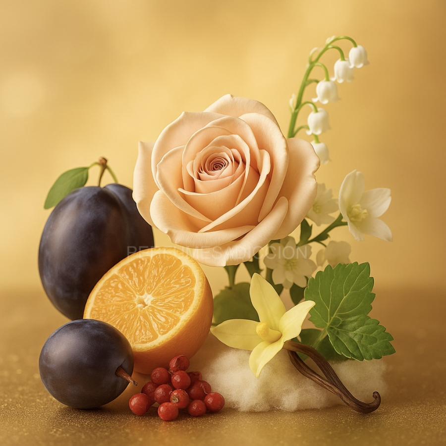 Una joya luminosa: ciruela dorada, flores radiantes y una vainilla cálida que brilla sobre la piel como oro suave.