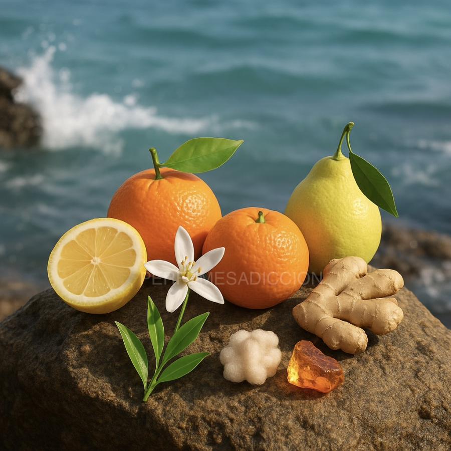 Un estallido cítrico y marino que refresca al instante: limón vibrante, toques acuáticos y un fondo limpio y ambarado que transmite energía, libertad y frescura moderna.