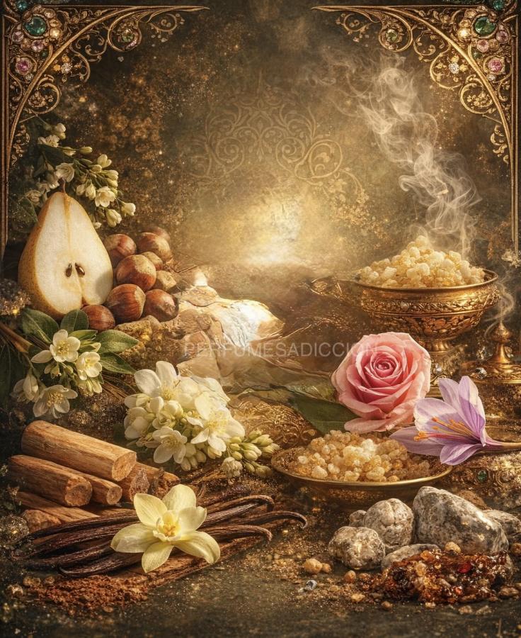 La apertura es intensa y luminosa, donde la jugosidad de la pera y la riqueza tostada de la avellana chispean con la calidez especiada de azafrán y el incienso de olíbano, proyectando una energía potente y envolvente. Su corazón floral late con una mezcla profunda y elegante de rosa y jazmín sambac, aportando una sensualidad sofisticada y un carácter floral saturado que se siente grande y persistente.