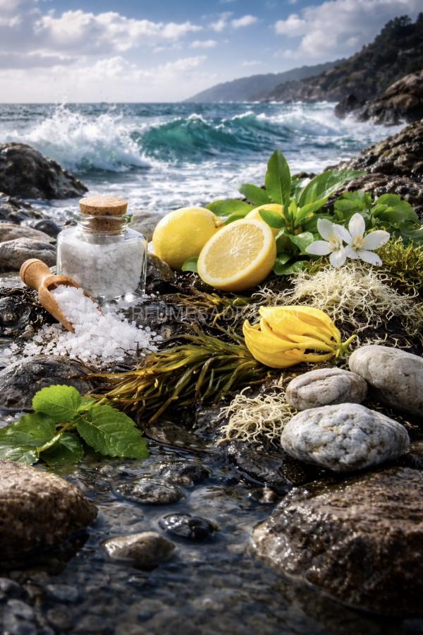 Desde el inicio se siente la sal mezclada con notas ozónicas y acuosas, acompañadas por la bergamota y el mirto que aportan una frescura vibrante, casi como una brisa marina fuerte golpeando el rostro. Es salado, luminoso y a la vez misterioso.
