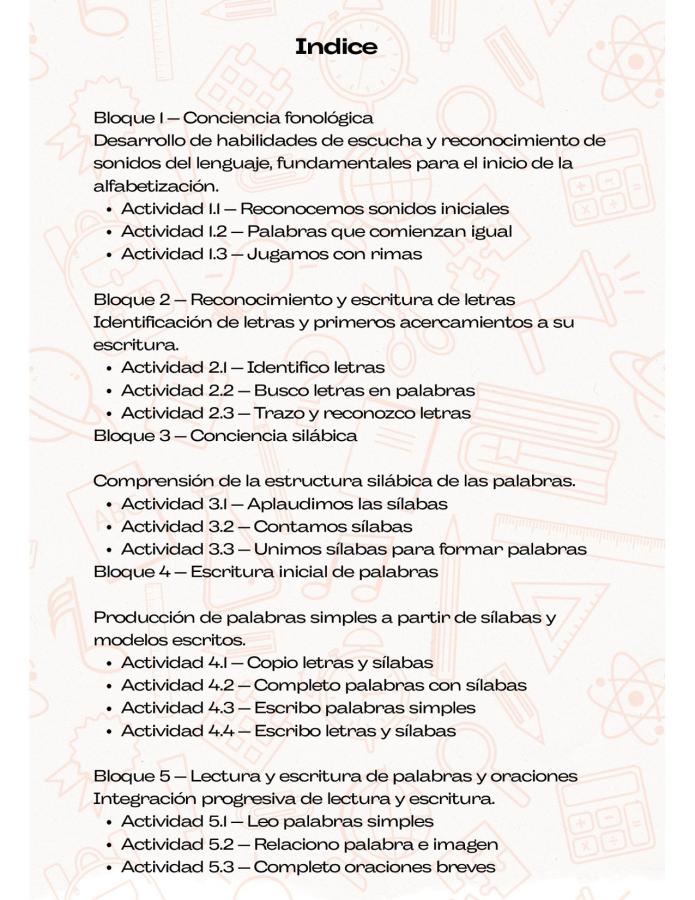 Este programa ofrece un conjunto organizado de actividades pensadas para acompañar a niños y niñas en el inicio del proceso de lectura y escritura, tanto en el hogar como en el ámbito escolar o en espacios de apoyo pedagógico.