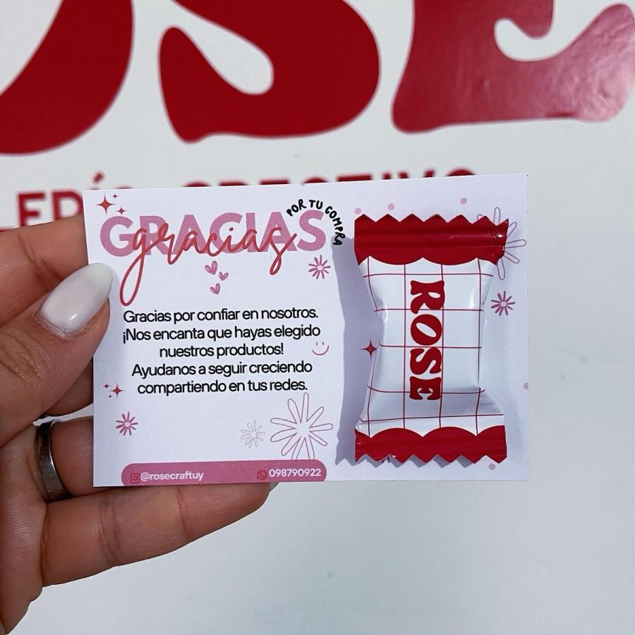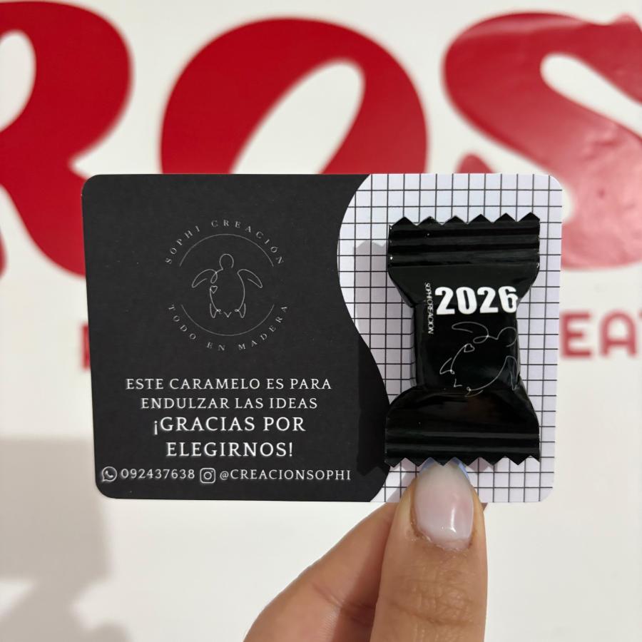 Nuestras Tarjetas con Caramelo Personalizadas son una forma original y encantadora de sorprender. Cada tarjeta se diseña con tu logo, frase o nombre, e incluye un caramelo que aporta ese toque dulce y especial que todos aman.