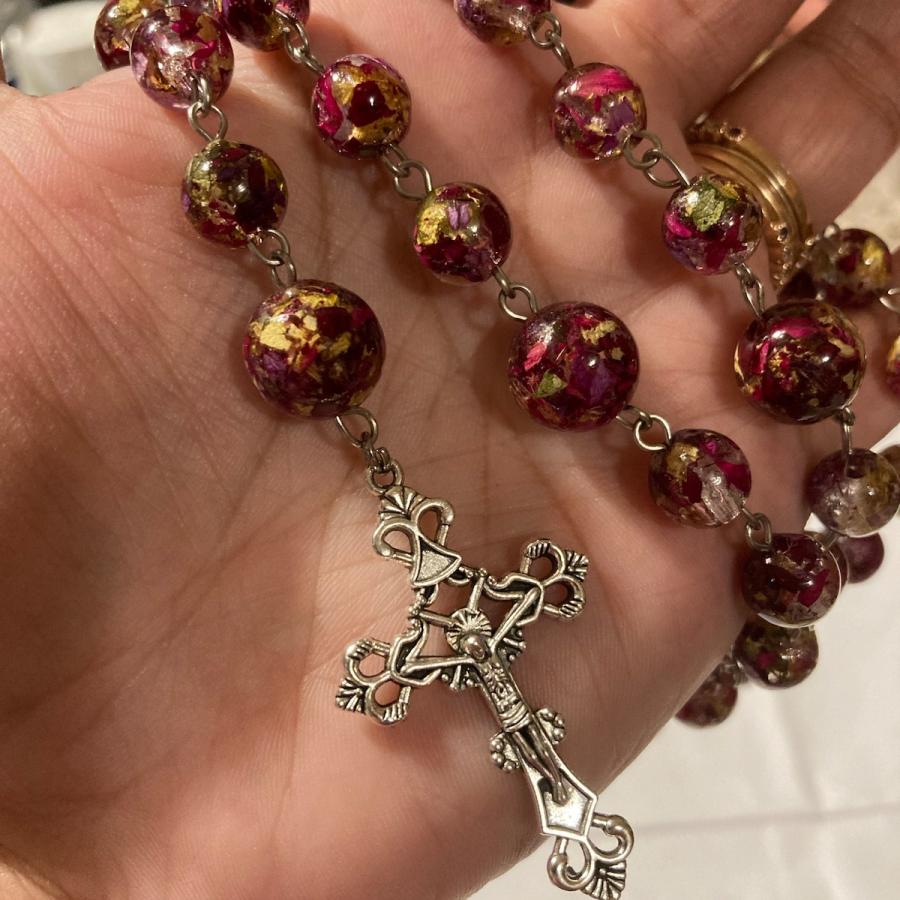 Convertí tus flores en un símbolo eterno de devoción y amor. Este rosario artesanal no es solo un objeto de fe, sino una pieza de memoria viva. Cada cuenta está confeccionada individualmente encapsulando pétalos de rosas reales en resina de alta transparencia, logrando un tono profundo y orgánico que conserva la esencia de las flores originales.
