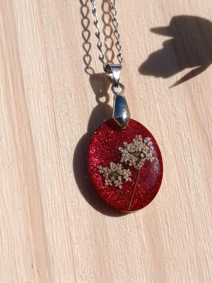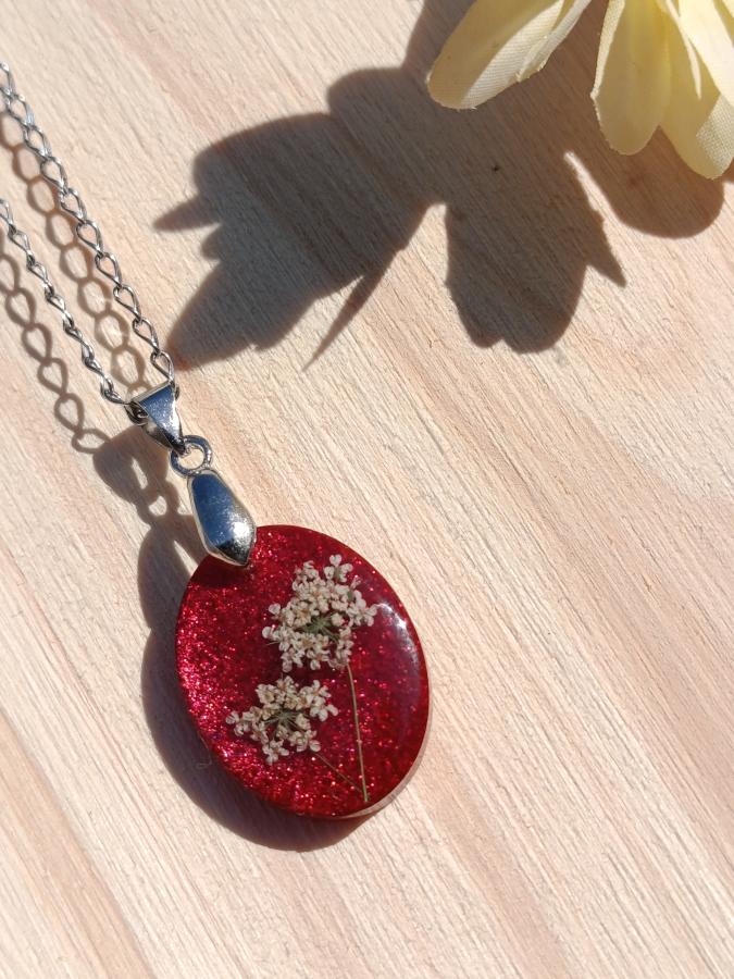 Hacé una declaración de estilo con nuestro dije artesanal "Pasión Botánica". Esta pieza presenta flores naturales de Encaje de Reina Ana cuidadosamente preservadas sobre un fondo rojo profundo con partículas de glitter que aportan un brillo tridimensional único.