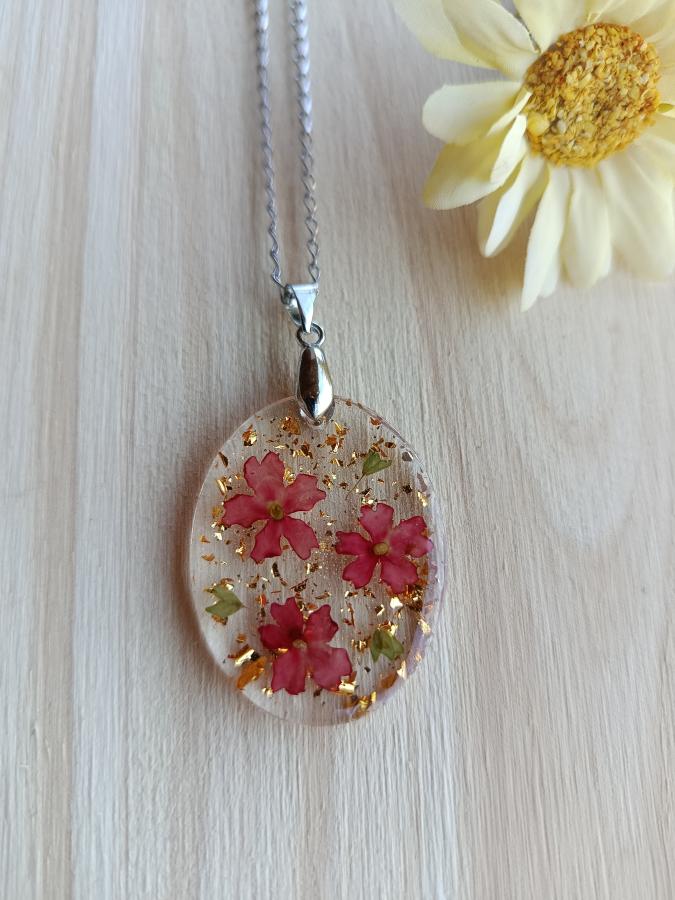 Capturá la frescura de la naturaleza con este dije artesanal único. Esta pieza ovalada encapsula flores reales de Verbena en un tono rosado vibrante, acompañadas de sutiles destellos de pan de oro que aportan una luminosidad elegante y sofisticada.