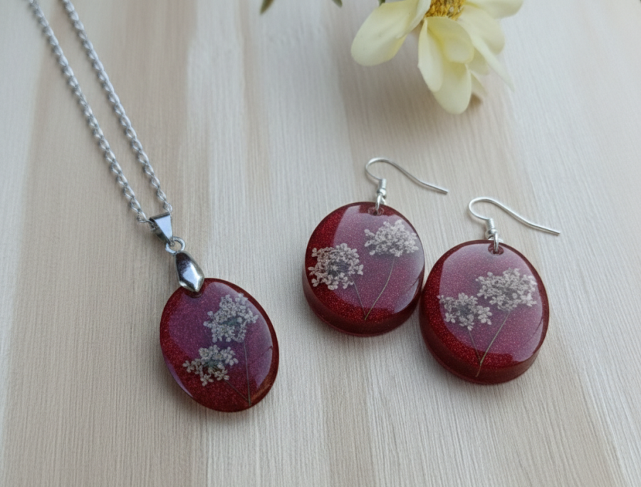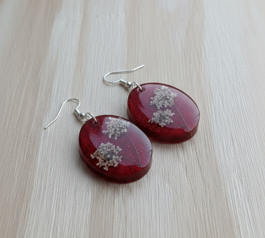 Impactante, audaz y profundamente femenino. Nuestra línea "Fuego Botánico" utiliza flores naturales de Encaje de Reina Ana preservadas sobre un fondo rojo escarlata con alta concentración de micro-glitter.
