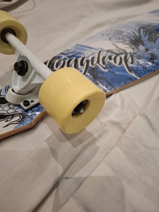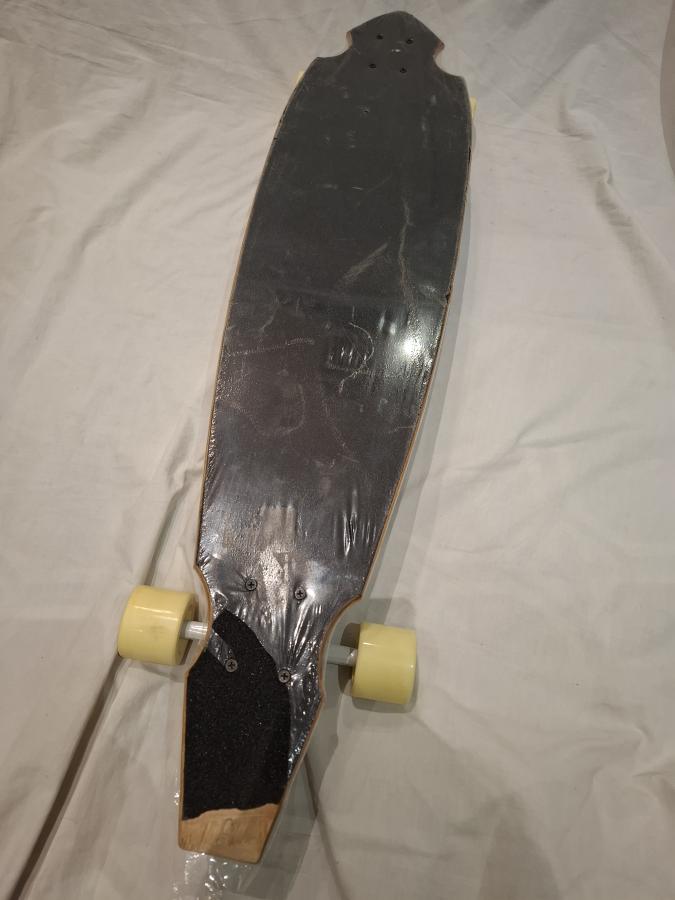 Patineta nueva de exposicion comercial estaba colgada y se callo, producto de eso se rompió la partecita de atrás como se ve en la foto pero no afecta su uso.