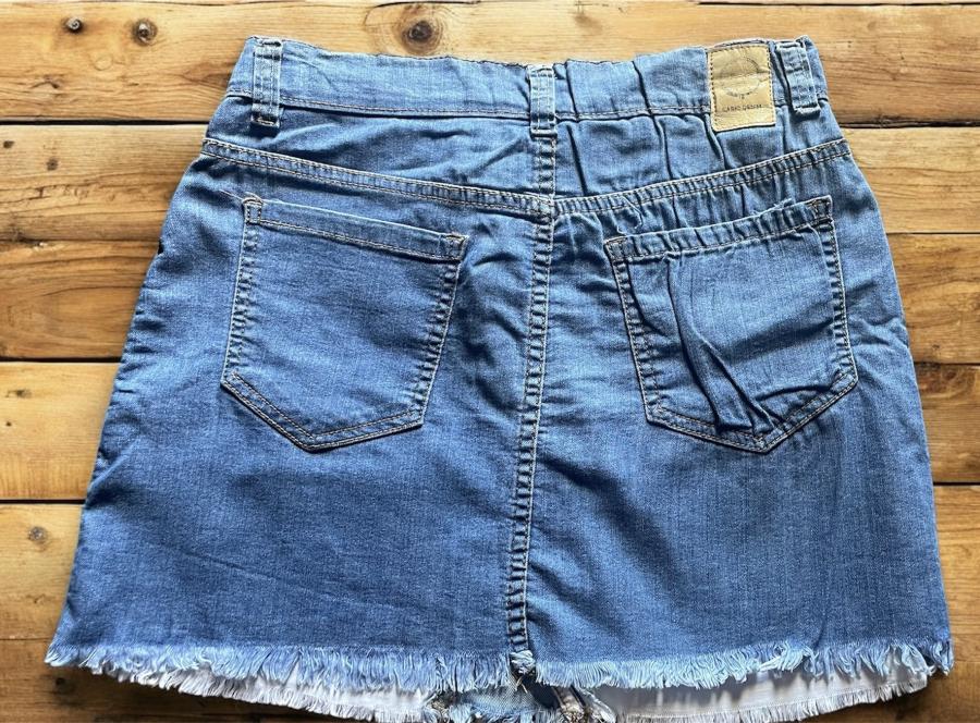Minifalda de jean bicolor con bajo deshilachado.Combina tonos claros y oscuros de jean para un contraste llamativo y actual.