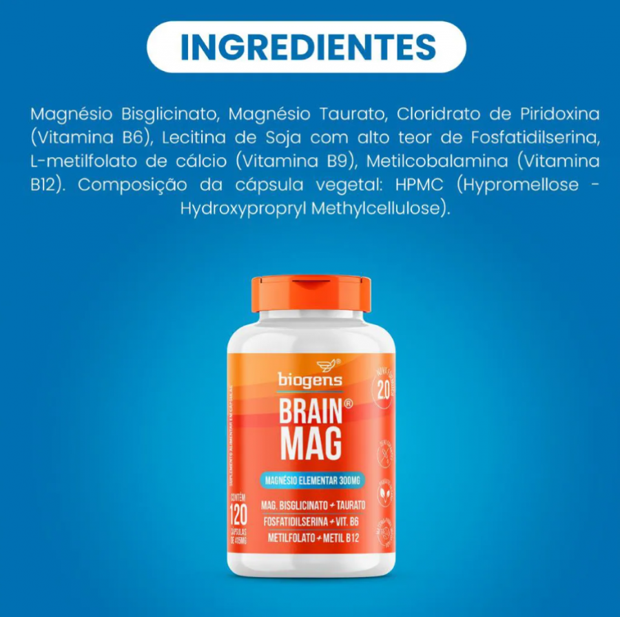 INGREDIENTES: Bisglicinato de Magnesio, Taurato de Magnesio, Clorhidrato de Piridoxina (Vitamina B6), Lecitina de Soja con alto contenido en Fosfatidilserina, L-metilfolato de calcio (Vitamina B9), Metilcobalamina (Vitamina B12). Composición de la cápsula vegetal: HPMC (Hipromelosa - Hidroxiproprilmetilcelulosa). NO CONTIENE GLUTEN.