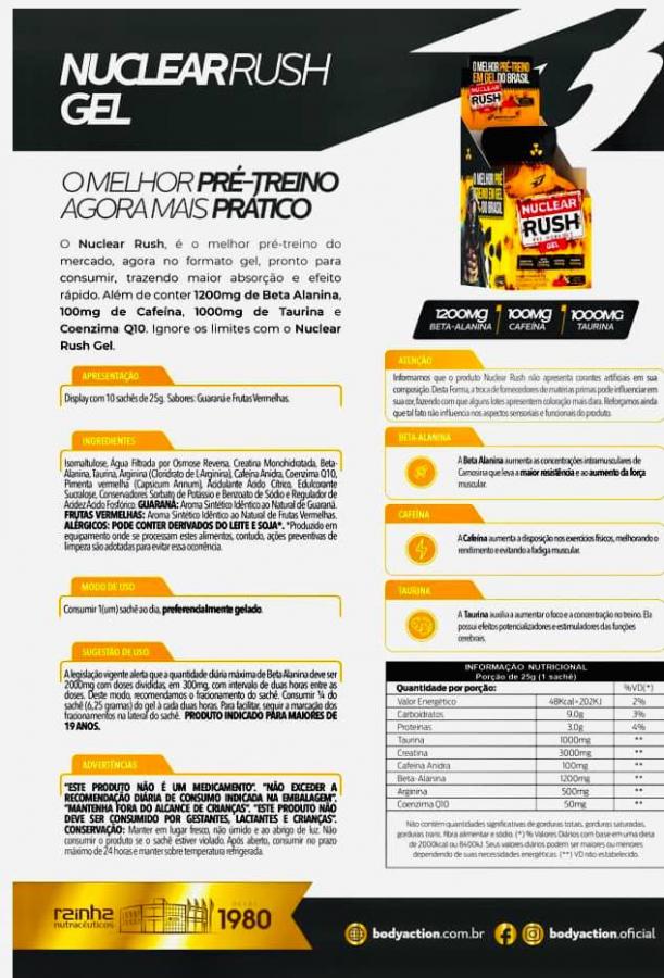 Nuclear Rush es el mejor pre-entrenamiento del mercado, ahora en formato gel, listo para consumir, aportando mayor absorcion y rápido efecto. Además de contener 1200mg de Beta Alanina, 100mg de Cafeina, 1000mg de Taurina y Coenzima Q10. Ignora los límites con Nuclear Rush Gel.
