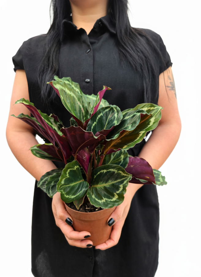 La Calathea Medallion es una planta tropical muy valorada por su follaje grande, redondeado y altamente ornamental. Sus hojas muestran un patrón simétrico en distintos tonos de verde, con bordes más claros y un envés púrpura intenso que le da profundidad y contraste. Es una planta elegante y protagonista, ideal para interiores que buscan un toque natural y sofisticado.