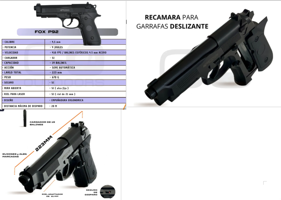 ¿Buscás una experiencia de tiro superior con una réplica de leyenda? La Fox P92 combina el diseño icónico de la Beretta 92 con una ingeniería de precisión, ideal para tiro deportivo y recreativo.