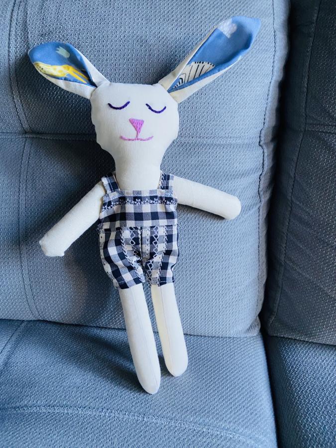 Muñeco de tela, confeccionado en lienzo, carita bordada y enterito negro. Hermoso conejo 🐇 ideal para los más chiquitos/as.