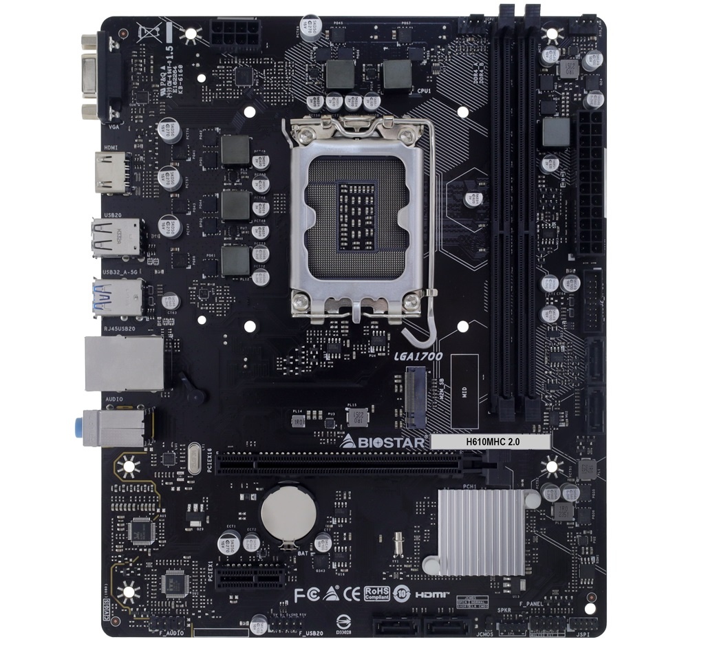 Formato: Micro ATXCompatibilidad: Intel Core i9/ i7/ i5/ i3 de 12a, 13a, 14a generacion.Chipset: Intel H610Memoria: 2 x DDR4 DIMM hasta 64 GB (total)Almacenamiento: 1 x M.2Lan: 10/100/1000 Mb/sVideo: DX12 / HDCPAudio: 7.1 canalesPCIe 4.0 / PCIe 3.0 M.2 (32 Gb/s)Conectores:1 puerto HDMI®1.41 puerto VGA2 puertos USB 3.2 (Gen1)4 puertos USB 2.01 puerto LAN3 conectores de audio
