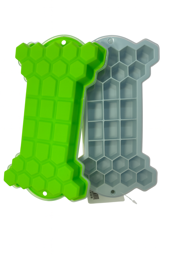 Molde de silicona flexible con forma de panal, ideal para hacer cubos de hielo fácilmente. Incluye tapa plástica para evitar derrames y olores en el freezer. Disponible en varios colores y resistentes al frío extremo.