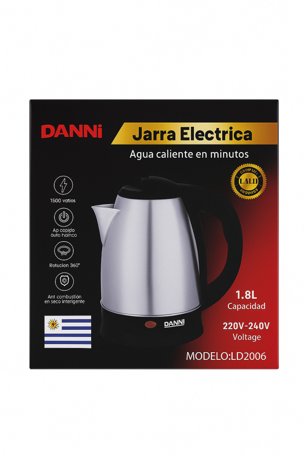 Jarra eléctrica de acero inoxidable DANNI, con capacidad de 1.8 litros, base giratoria 360° y apagado automático para mayor seguridad. Ideal para calentar agua rápidamente con sus 1500W de potencia. Diseño moderno, resistente y práctico