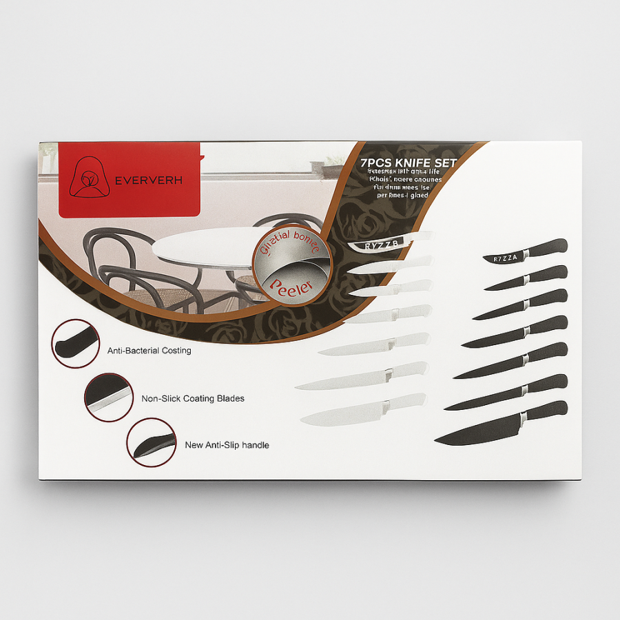Set completo de cuchillos con revestimiento antiadherente, mango antideslizante y hoja afilada para todo tipo de cortes. Incluye pelador de regalo. Ideal para tu cocina o como regalo práctico y elegante.