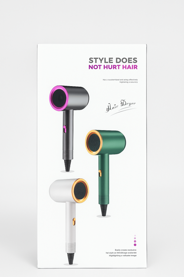 Secador de pelo moderno con diseño liviano y ergonómico. Ideal para uso diario, ofrece dos niveles de velocidad y potencia para un secado rápido y eficiente sin dañar el cabello. Su tamaño compacto lo hace perfecto para viajes o el hogar.