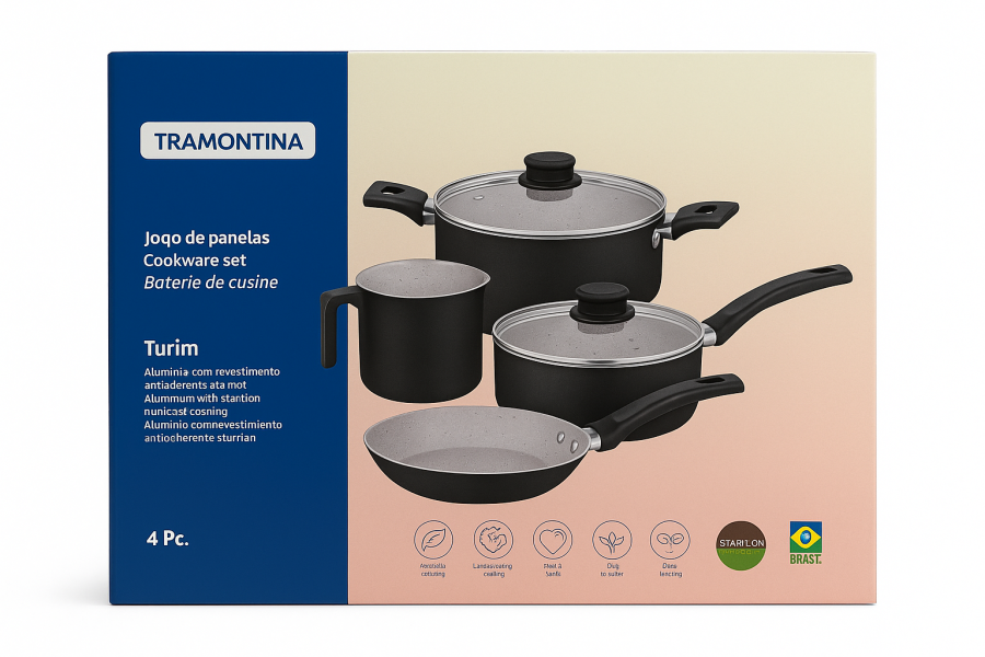 Set de cocina Tramontina Turim de 4 piezas en aluminio con revestimiento antiadherente Starflon. Ideal para uso diario: fácil de limpiar, resistente y fabricado en Brasil con la calidad que distingue a Tramontina.
