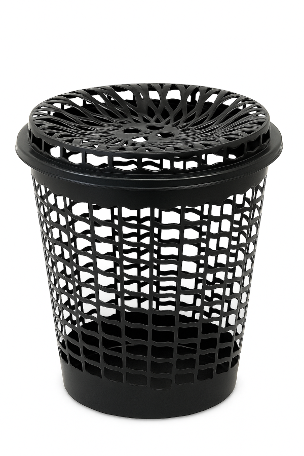 Cesto para ropa sucia de 56 litros con diseño calado moderno y tapa decorativa. Fabricado en plástico resistente, ideal para mantener la ropa organizada y con buena ventilación. Su estilo elegante en color negro combina con cualquier ambien