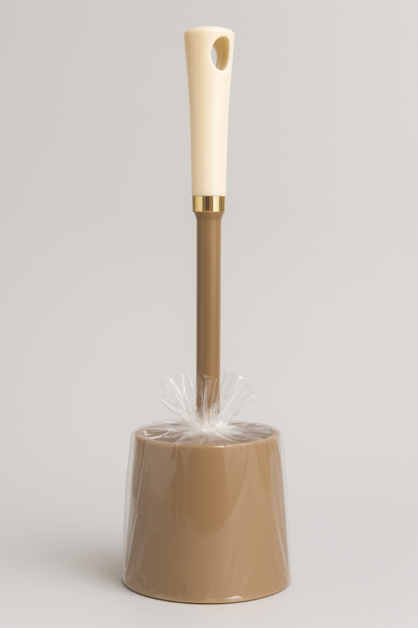 Escobilla sanitaria premium con base cerrada, diseño moderno en tono beige/marrón. Ideal para mantener el baño limpio y ordenado. Material resistente, fácil de lavar y con mango ergonómico.