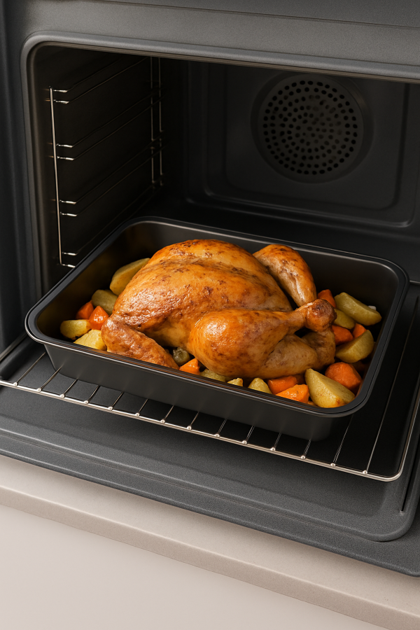 Asadera chica de 42 x 29 cm con revestimiento antiadherente, perfecta para cocinar carnes, verduras, galletas, tortas y mucho más. Diseño resistente, bordes reforzados y fácil de limpiar. Tamaño práctico para usar en cualquier horno.